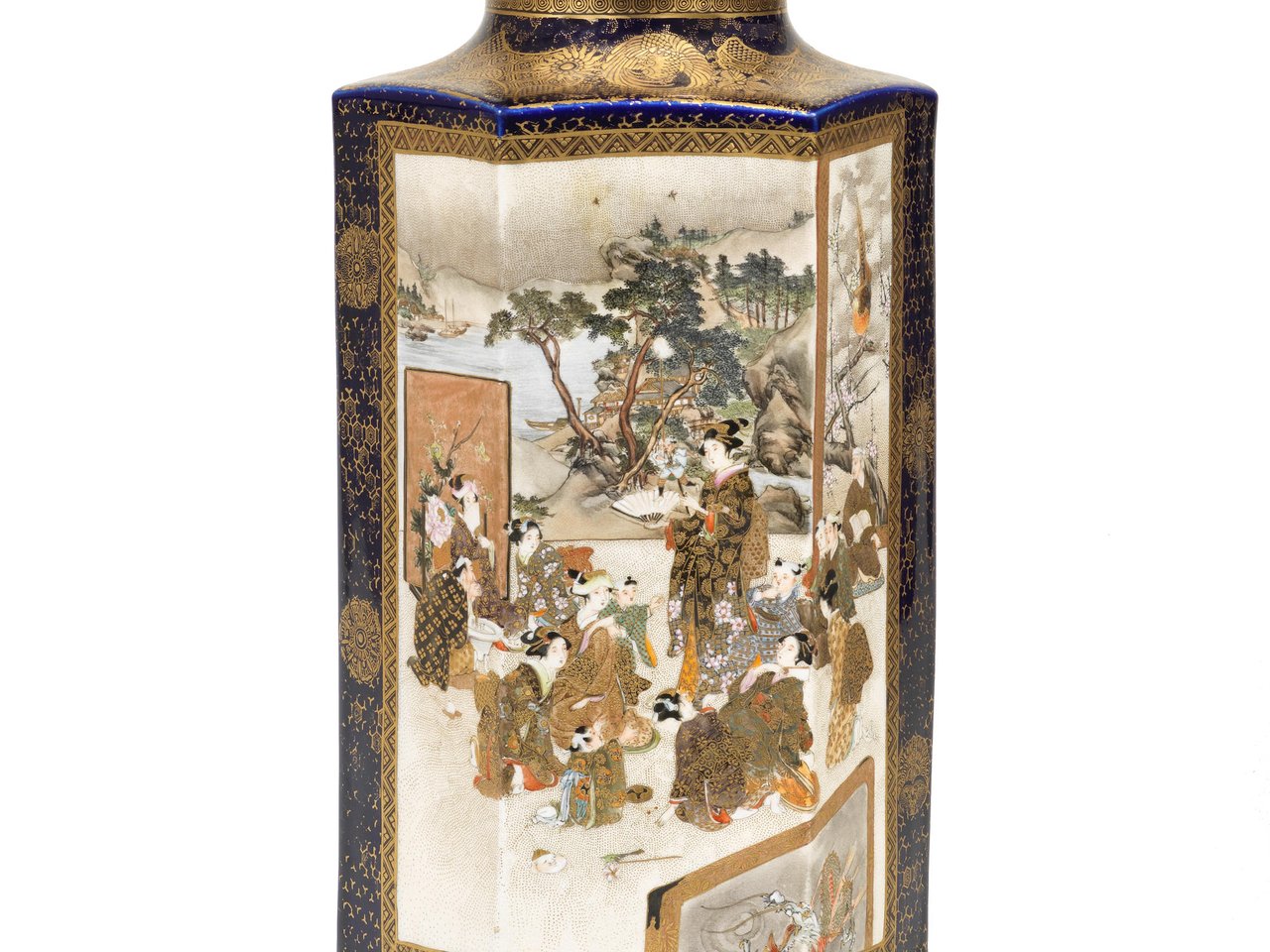 Decorated in enamels and gilt, the body with two large rectangular panels, each enclosing a contrasting figural scene depicting on one side the interior of a sumptuous household, the residents at leisure, a woman in the centre manipulating a puppet of a yakko holding a keyari (spear made of bird feathers) entertaining the women and children seated on the floor with toys and masks strewn around them, in front of a tall dragon-embellished screen, a lakescape in the background, the other side showing a lively outdoor rural spring scene with peasants and their families strolling along the shores of a lake, a vegetable seller seated in the foreground before excited children chasing a family of chickens, all on a blue ground decorated with fragmented geometric and floral motifs and stylised crests; signed on the base Dai Nippon Kichizan zo within a seal.
