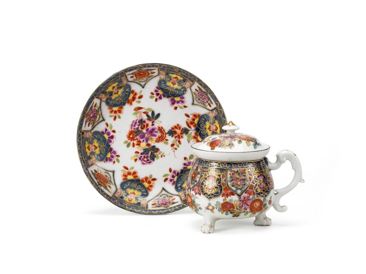 Painted in Imari style in underglaze-blue, enamels and gilding, with sprays of indianische Blumen and lambrequin borders. the reverse of the stand with flowering branches in underglaze-blue and iron-red, caduceus mark and crossed swords mark with a dot in underglaze-blue (minor chips, the stand with repaired rim section, rim chip and haircrack) (3)