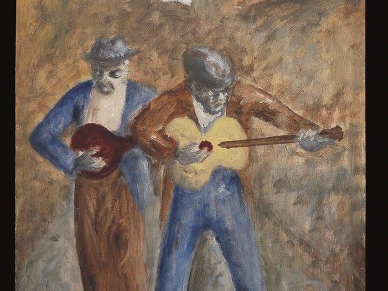 L. Cavallo, Ottone Rosai, Edizioni Galleria Il Castello, Milan, 1973, reproduced no. 144. The pictorial conduction of the composition is fully visible: it seems like we are witnessing Rosai"s work as he constructs the scene quickly and almost with a touch of ironic violence. The walls of the houses in the background are animated by the same anxiety that makes the brushstroke on the bodies corrugate, and they pulsate together with the storytellers, kept vibrant by the explicit sound accompaniment. Florence, the Oltrarno, for the artist is this reflection of chromatic values and harmonic values: the musicians are the soul of the small streets and give voice to the district even when it seems in a silent and painful dimension. How many times has Rosai returned to this motif, and thus repeats, confirms his basic idea that Man is the city and the city is Man, with his voices, his absences, his rites. C.