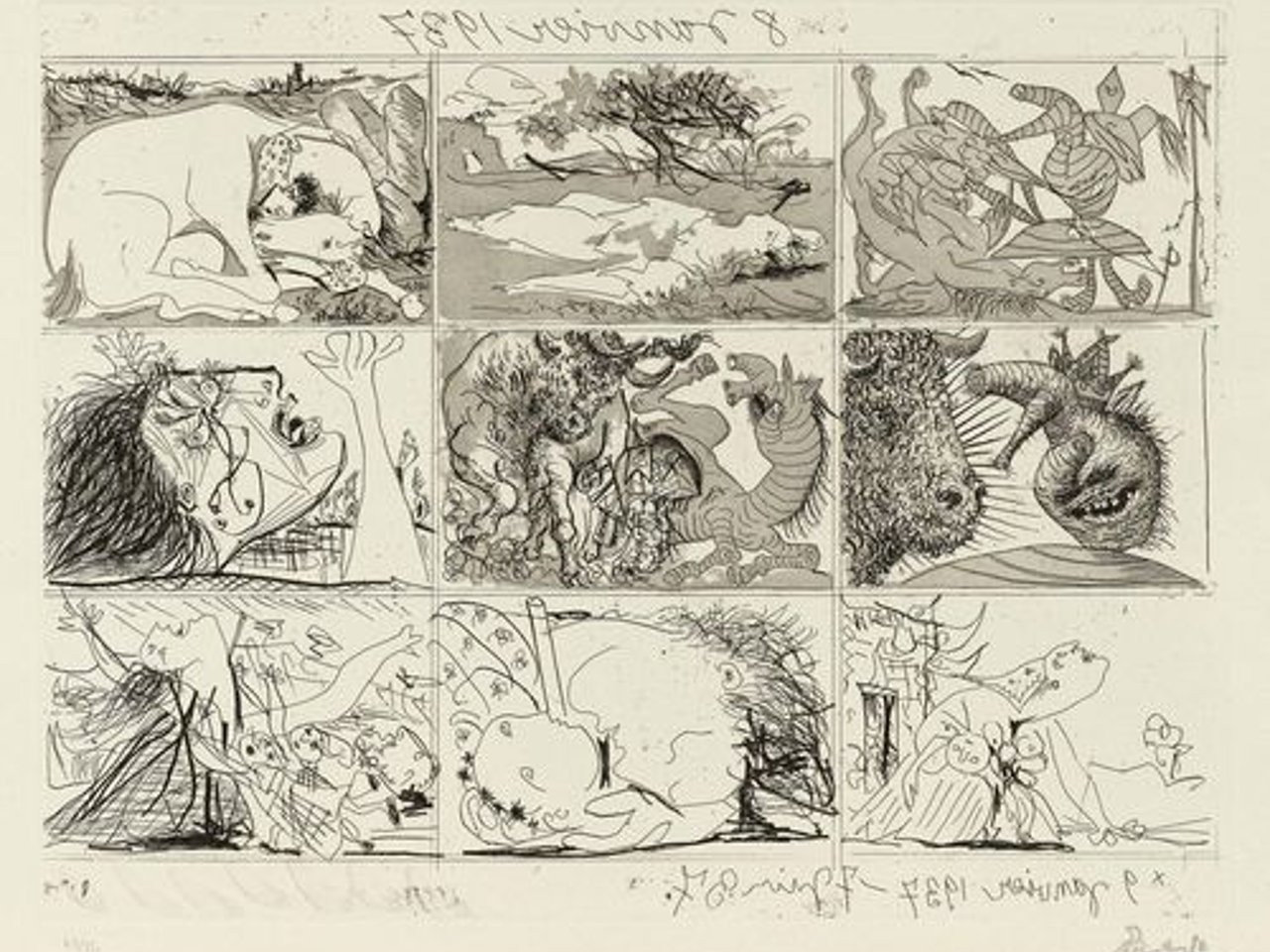 Folder with two etchings and a double-sided text sheet. Both etchings each with the stamp signature: Picasso at the bottom right, and the number 43 / 850 at the bottom left. Sheet one and two in the plate are dated at the top center: 8 janvier 1937, sheet two with the additional date in the plate at the bottom right: 9 janvier 1937-7 juin 37. The text sheet contains a reproduced, handwritten text by Picasso on the first page, There is also a typewritten text in Spanish and its French translation on the back. Both plates 31.7 x 42 cm each on Vergé de Montval. In a soft cardboard folder, bound in gray, sturdy wove paper with the affixed plaque bearing Picasso"s reproduced, handwritten title.