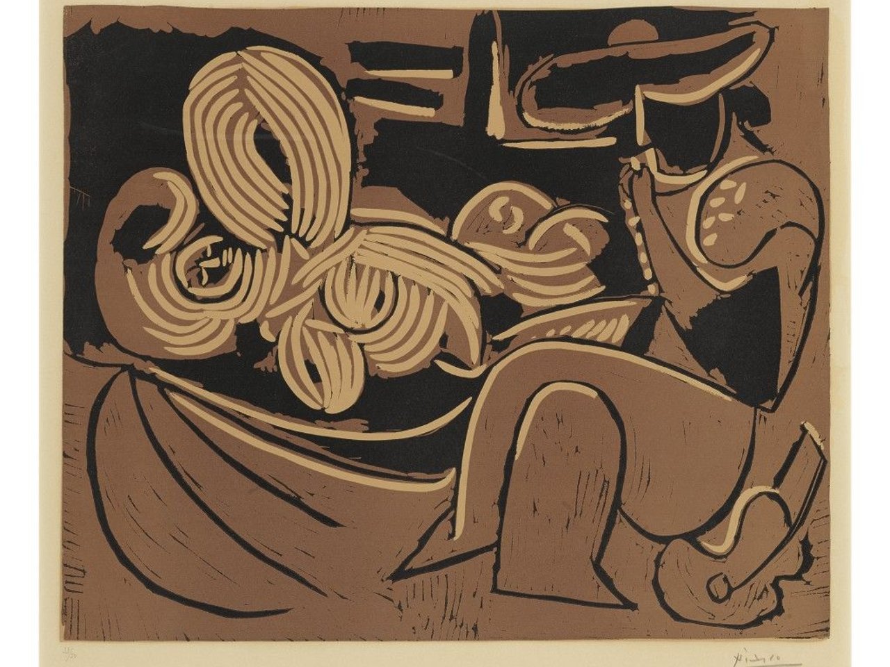 L'AUBADE, AVEC FEMME ENDORMIE (FEMME COUCHÉE ET HOMME À LA GUITARE) (B. 916; BA. 1234), 1959