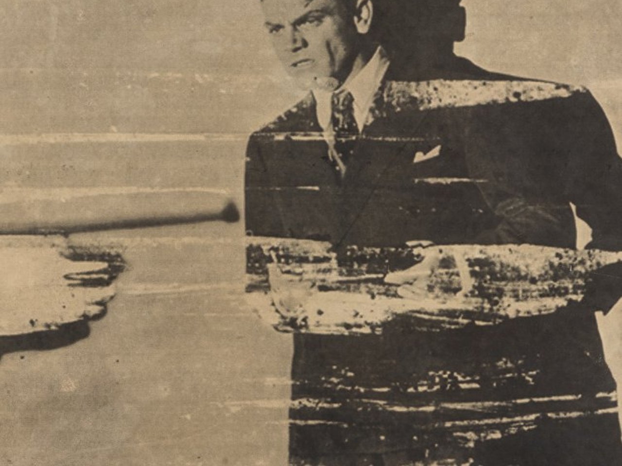 Offset on chamois-colored paper. 44.0 x 59.0 cm. Stamped on the reverse: Copyright (C) Andy Warhol 1972, Printed in Styria Studio Inc. (blue ink). Warhol based this work on a film still from the 1938 gangster movie "Angels with Dirty Faces", starring James Cagney. He cropped the still at the bottom and left, heightening the dramatic and menacing nature of the scene. Cagney is one of Warhol"s first screenprints on paper, this offset is printed ten years later. The white streaks through the composition are the result of printing irregularities that left blank, uninked areas on the paper. During this early moment in his career, Warhol embraced the imperfect, handmade, and almost painterly quality of such accidents