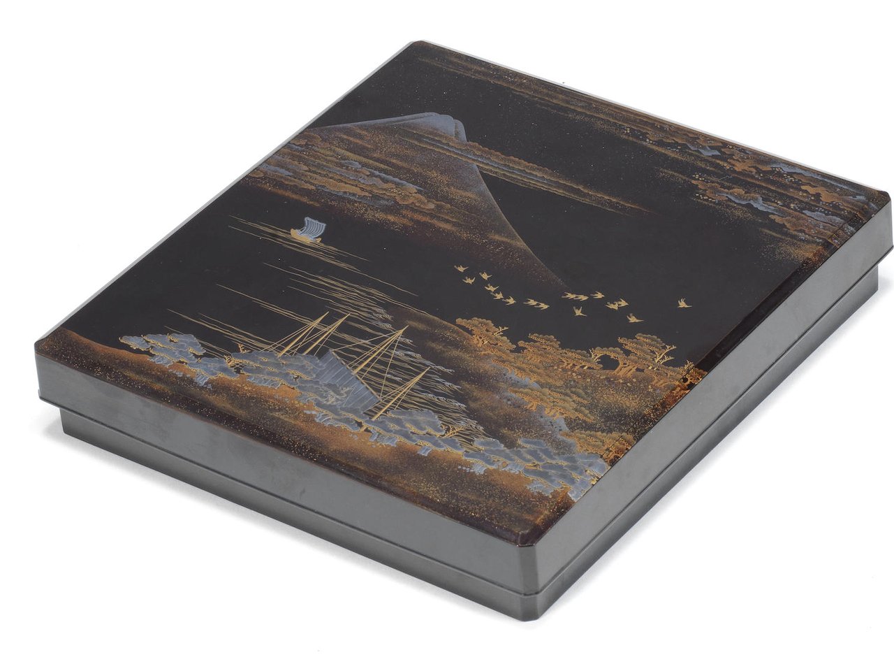 Of standard rectangular form with kabusebuta (overhanging lid), entirely covered in black lacquer, the exterior of the lid decorated in gold and hiramaki-e, takamaki-e, kirikane, and other techniques with a seaside scene with Mount Fuji in the background and sailing boats, waves, pines, and gulls in the foreground, the interior of the lid with a large silver-inlaid crecent moon with autumn plants including hagi (bush clover, Lespedeza bicolor), ominaeshi (valerian, Patrinia scabiosifolia, and chrysanthemum, all against a gold muranashiji ground which extends to the interior of the box, fitted with a partially gold-lacquered suzuri (ink stone) and a rectangular silver suiteki (water-dropper); with a tomobako wood storage box inscribed inside Shu Meiji sanjurokunen chuto daijuichigatsu Kuwano Ishi (Fine quality; November 1903, Kuwano Ishi). (6).