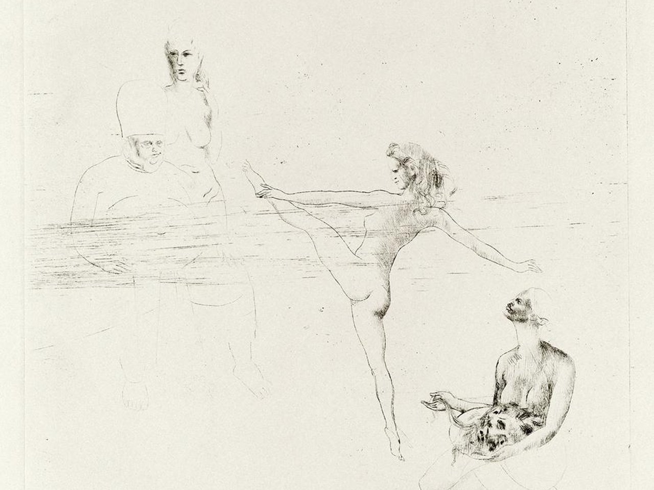 Drypoint, 1905. 405x350 mm; 16x13 3/4 inches, full margins. Edition of 250. Van Gelder watermark. Printed by Louis Fort, Paris. Published by Vollard, Paris. From La Suite des Saltimbanques. A superb impression with strong contrasts, burr on John the Baptist's head and the contours of the figures and crisp, partially inky plate edges.