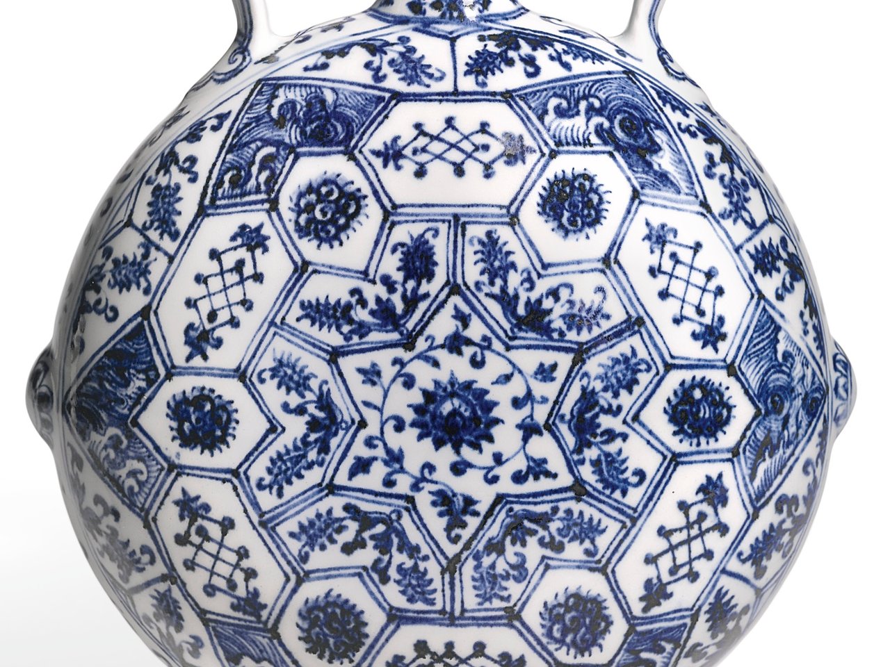 modelled after a Middle Eastern metal prototype, elegantly potted with a flattened spherical body set with two circular bosses at the sides, rising to a garlic neck flanked by a pair of loop handles with ruyi-shaped terminals on the shoulders, all supported on a spreading foot of circular form, the front and back domed faces intricately painted in deep cobalt-blue tones with geometric panels, the centre with a lotus bloom wreathed by foliate stems within a star-shaped panel, surrounded by six indented eight-sided panels enclosing floral sprays with serrated leaves, all encircled by six hexagonal panels of stylised flowerheads alternating with similar elongated panels of interlaced lozenges, the outer border with shaped panels enclosing crashing waves forming the corners of a large hexagon, interspersed with pairs of narrow panels of flower scrolls, all divided by double line borders, the narrow sides of the flask decorated with a composite floral scroll interrupted by flower heads on the raised bosses, the neck collared by a band of stylised floral sprigs, below a garlic-form mouth painted with ruyi-shaped lappets enclosing stylised floral sprays, the foot skirted with pendent trefoil spearheads above a band of small florets, the unglazed base with a deep glazed recess in the centre