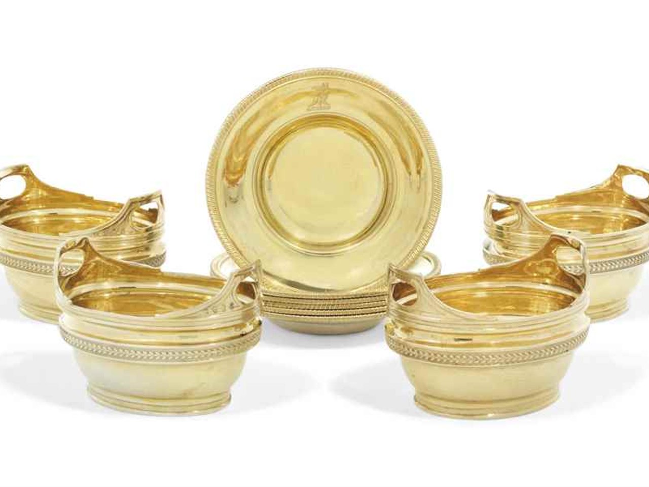 A SET OF FOUR GEORGE III SILVER-GILT SALT CELLARS AND SIX STANDS by Anonymous