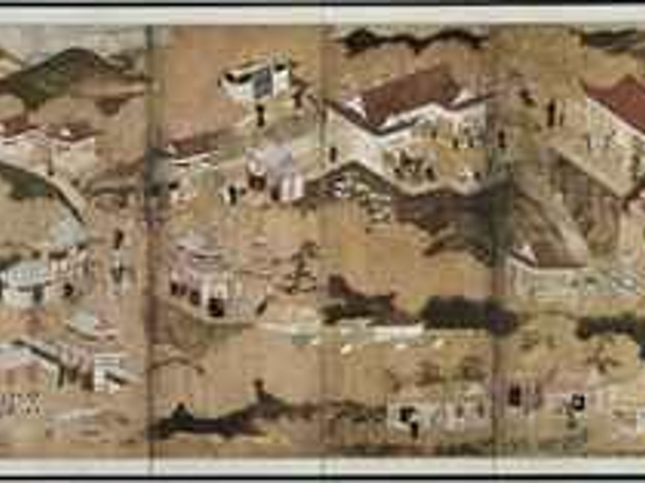 six-panel screen; ink, color and gold flecks on paper