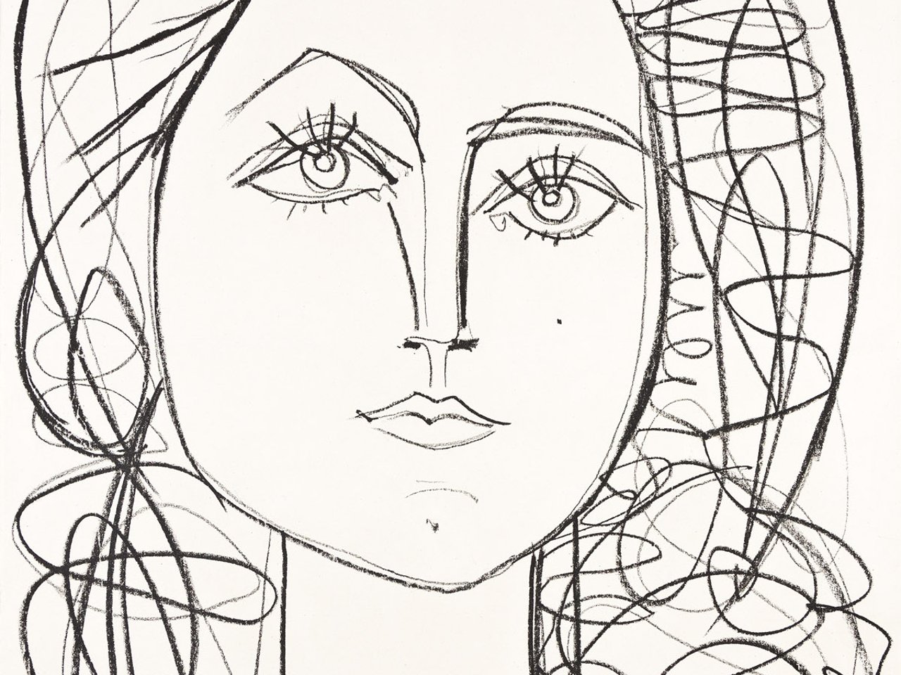 In this lithograph, from a series of 11 different versions Picasso made during June 1946, Picasso shows her with characteristic narrow, arching eyebrows, full lips and youthful visage. Picasso"s old friend Henri Matisse, who was fond of Gilot and found artistic inspiration in her feminine beauty as well, remarked that he would paint her with a pale blue body and leaf-green hair, which prompted Picasso to create La Femme-Fleur , 1946, another famous portrait of Françoise, hyper-stylized with a pale blue body and leaves for hair. Bloch 399; Mourlot 43; Reuße 150.