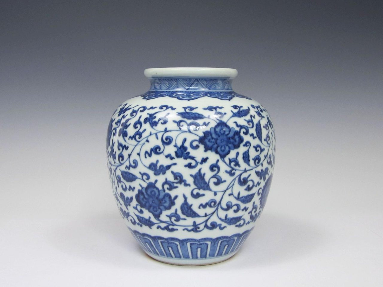Painted in the Ming style, with scrolling lotus to body, bands of ruyi-clouds to shoulder and lappets at foot