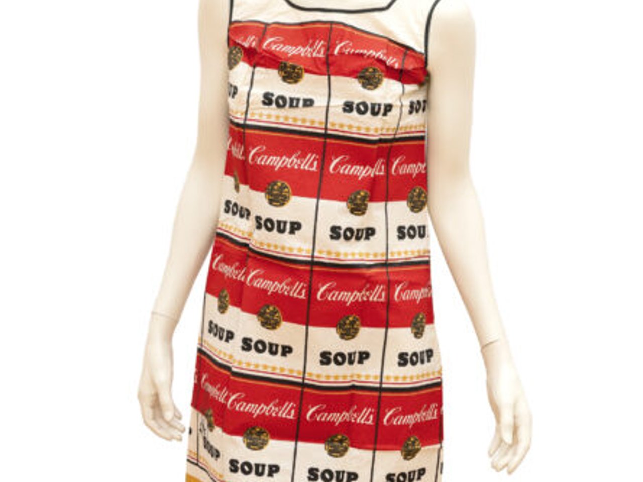 Silkscreen in colors on cotton cellulose fabric. (1968). C. 94 x 58 cm. Inscribed in the neckline on the original typographic label. The dress was signed by Andy Warhol in 1980 on the front in the lower left.