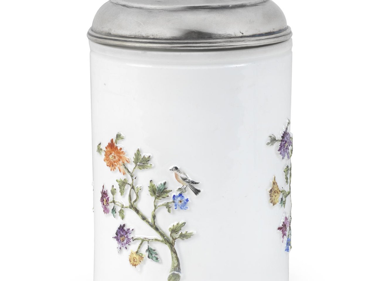 Moulded with three flowering branches, embellished in polychrome enamels, (restored)