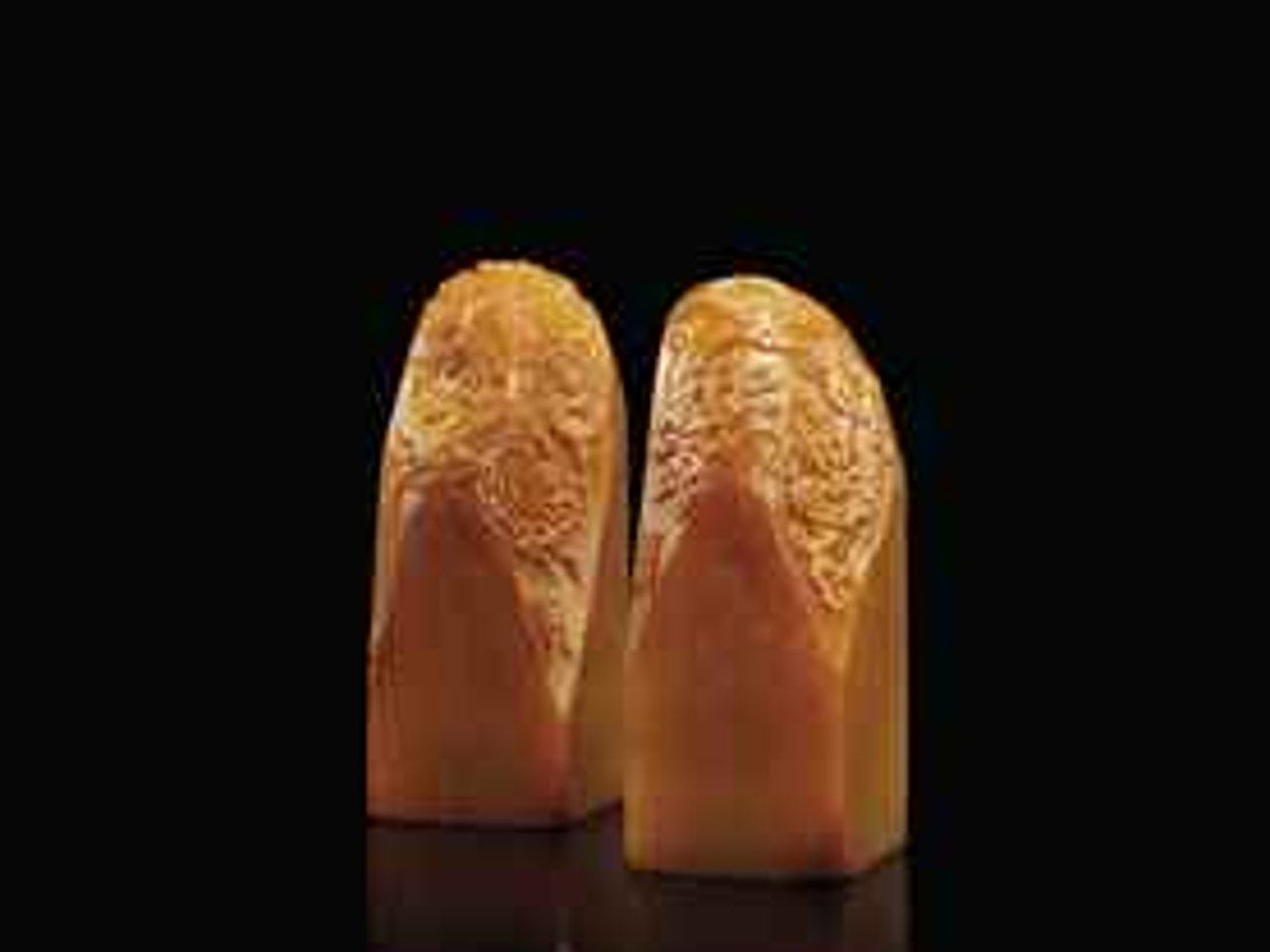 The seals are carved from a single boulder with square section rising to a sloping upper surface. The top of one is carved in low<br/>relief<br/> dexterously utilising the skin of the stone<br/> with a dragon gazing down on its young striding amongst lingzhi<br/> echoing the pair of phoenix soaring amidst peonies on the other<br/> both scenes positioned above a signature<br/> Cangmen. The ‘dragons’ seal is incised on one vertical side with a seven-character stanza followed by a signature<br/> Lin Ji<br/> dated 11th day of the ninth month of yihai cyclical year<br/> corresponding to 1719<br/> the seal face is carved in intaglio with an eight-character inscription<br/> Huang liuzi Heshuo Gong qinwang<br/> ‘The sixth imperial son<br/> The Peaceful and Eminent Prince Gong’. The ‘phoenix’ seal is similarly incised on one vertical side with a five-character stanza followed by a signature<br/> Ziwei Neishi<br/> the seal face is carved with a four-character inscription<br/> weiguo fanfu<br/> (Guardian vassal of the state) in intaglio<br/> flanked by a pair of chilong below a two-character inscription yuci<br/> ‘imperially bestowed’<br/> in relief. The stones are of a deep honey tone suffused with characteristic ‘radish’ veining.