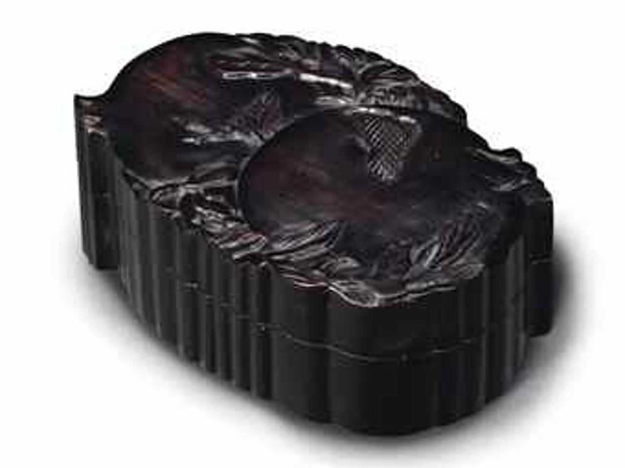 The box and cover are carved in the form of two conjoined pomegranates borne on leafy branches, the sides with wedge-shaped ribs.