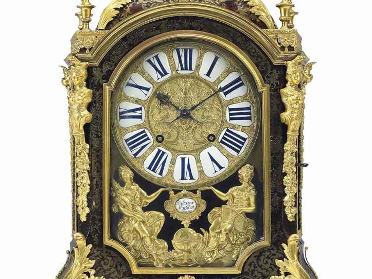 The case with galleried cornice, on later feet, the dial with white enamel chapters and enamel signature plaque below 'Balthazar/Martinot/Paris', the twin barrel movement with later Brocot anchor escapement, countwheel strike to bell, the backplate signed 'Balthazar/Martinot A Paris'