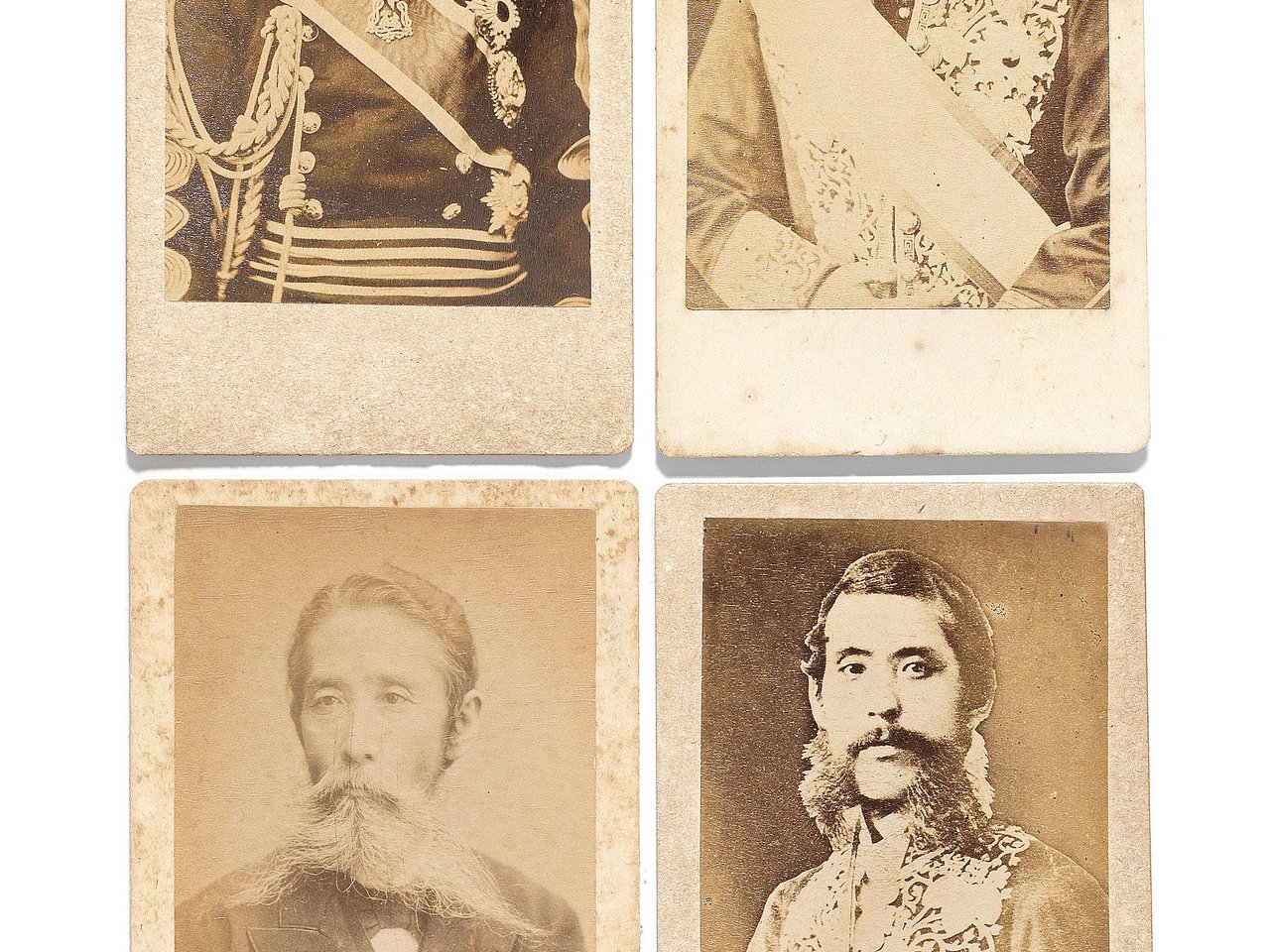 19 small and one larger photographs, mounted on card, consisting as follow: (1) Yamagata Aritomo (1838-1922), a feudal retainer of the Choshu Domain; (2) Prince Arisugawa Taruhito (1835-1895); (3) Terashima Munenori (1832-1893), a politician; (4) Saigo Judo (1843-1902), a feudal retainer of the Satsuma Domain; (5) Oyama Iwao (1842-1916), a feudal retainer of the Satsuma Domain; (6) Ito Hirofumi (1841-1909), a former Prime Minister; (7) Sanjo Sanetomi (1837-1891), an imperial court noble; (8) Kuroda Kiyotaka (1840-1900), a feudal retainer of the Satsuma Domain; (9) Itagaki Taisuke (1837-1919), a feudal retainer of the Tosa Domain; (10) Inoue Kaoru (1836-1915), a politician; (11) Prince Komatsu Akihito (1846-1903); (12) Iwakura Tomomi (1825-1883), an aristocrat and politician; (13) Kido Takayoshi (1833-1877), a feudal retainer of the Choshu Domain; (14) Prince Kitashirakawa Yoshihisa (1847-1895); (15) Okubo Toshimichi (1830-1878), a feudal retainer of the Satsuma Domain; (16) Emperor Taisho (1879-1926) as a child; (17) Kuki Ryuichi (1852-1931), a feudal retainer of the Ayabe Domain; (18) Hijikata Hisamoto (1833-1918), a feudal retainer of the Tosa Domain; (19) Suematsu Kenchou (1855-1920), a politician; (20) Larger photograph: unidentified, printed on the reverse in English S. Ichida, Photographer, Hiogo, Japan. The small photographs (including card mount)