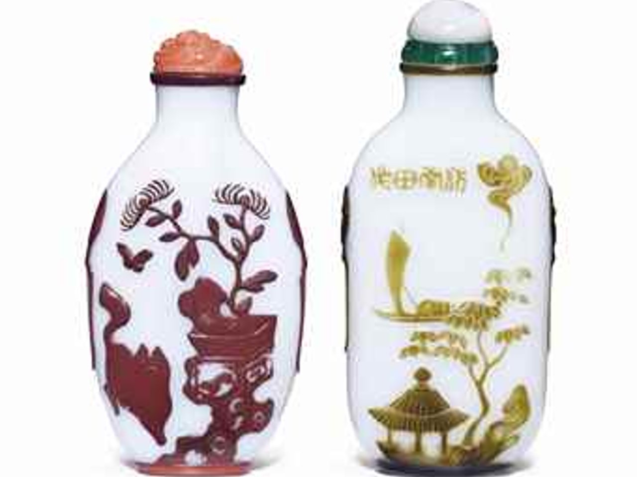 TWO OVERLAY MILKY-WHITE GLASS SNUFF BOTTLES by Anonymous