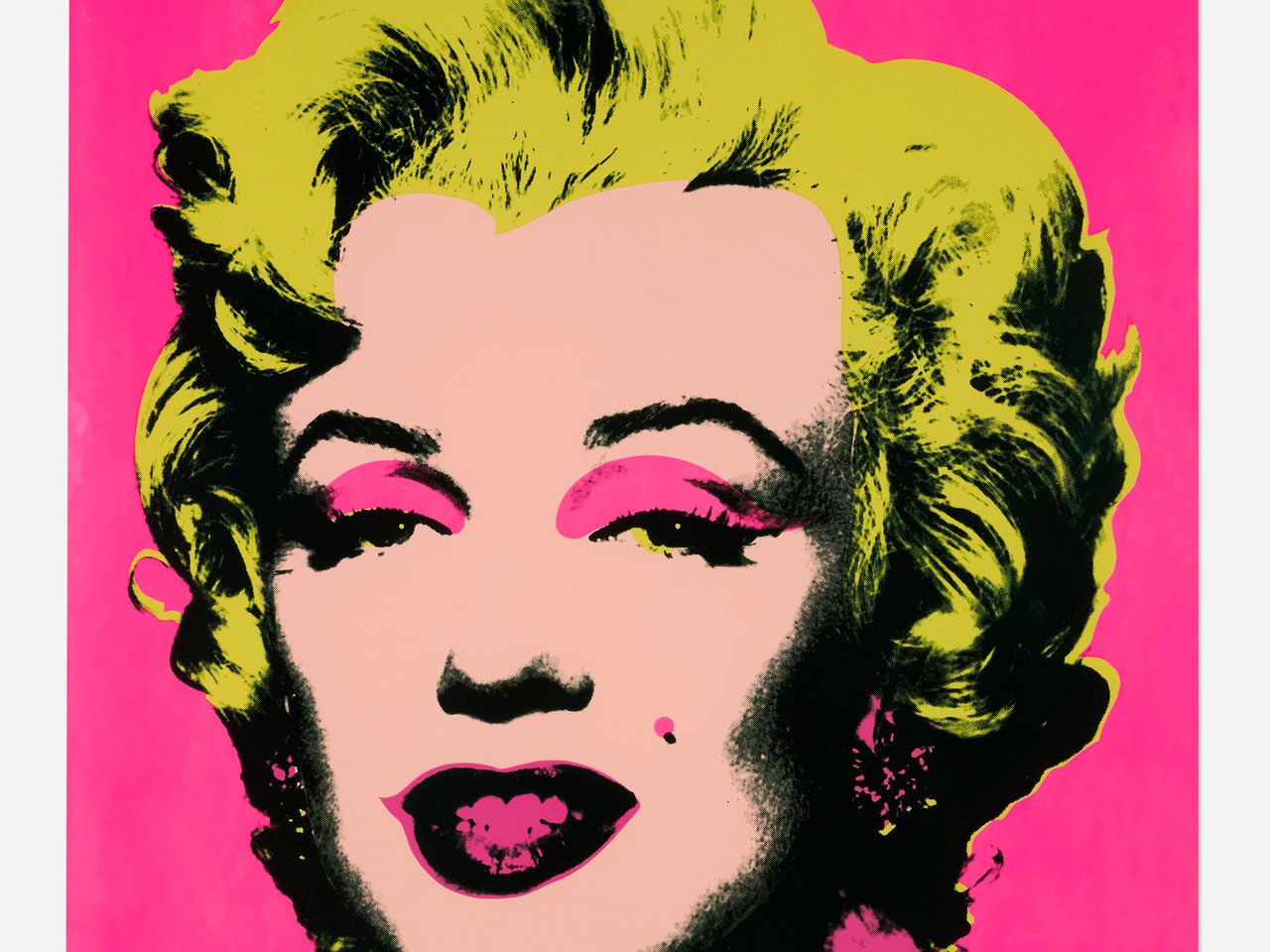 Work is in good condition. Occasional soft scuffing in places, primarily visible in raking light, and one short crease, measuring approximately .25 inch within pink field above subject"s right eye. Occasional printing inconsistencies within pink field above both eyes and areas of minor soiling at upper left and right sheet edges. Pinpoint touch ups primarily at the sheet edge and faint handling creases to lower right and upper center. Overall, work presents well with strong colors. Framed without glazing measuring 37 x 37 inches.