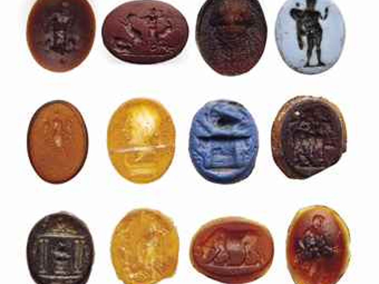 Including one with a snake-legged giant; one with Hercules standing between two of the man-eating horses of Diomedes, holding the bridle of one, his club raised in his left hand, nude but for his lion skin draped over his right arm, two dying horses to the left, a dying man to the right, on a groundline; one with a frontal mask, perhaps a bearded satyr; one with a standing nude male, mantle draped over his right arm, perhaps also holding a sheathed sword; one with a composite figure of Isis with a scorpion body, the pincers in the form of serpents, her head in profile to the left, wearing a solar disk and cow horn crown; one with a portrait head of a woman in profile to the left above the prow of a ship; one with an eagle and a standard above an altar with a quadriga in relief, with bull heads projecting to the sides, a standard to the left, all upon a ship; one with Paposilenus riding on a donkey to the right, on a groundline; one with a temple to Jupiter framing his eagle upon an altar, a dolphin below; one with a warrior or hero standing before a serpent-entwined tree surmounted by an owl, the warrior nude but for a cloak over his shoulders, holding a shield and a spear, wearing a crested helmet; one with a bull with its head lowered, facing left, on a groundline; and one with Hercules, depicted nude, his animal skin draped over his right hand