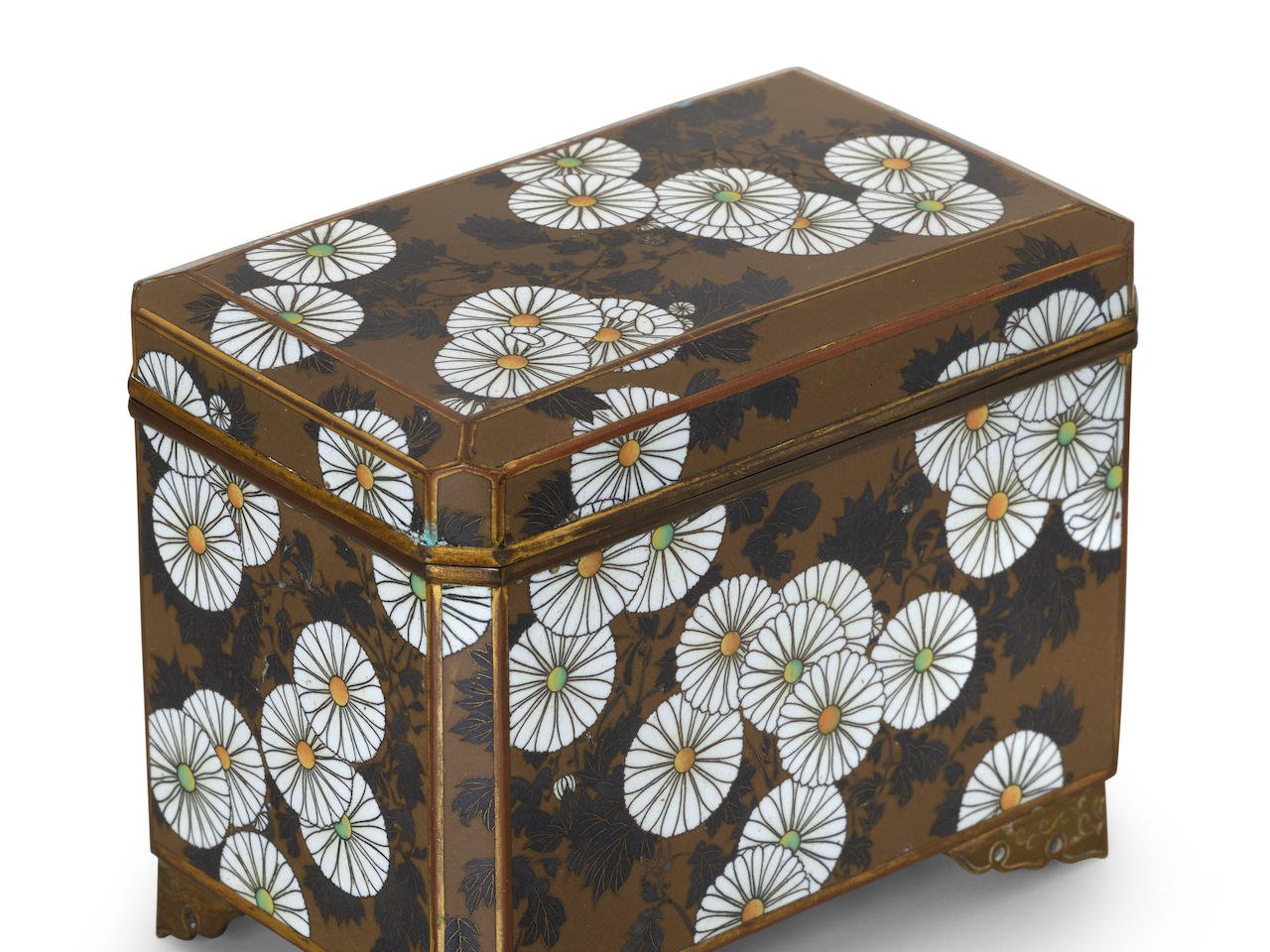 Rectangular with beveled corners and raised on four short gilt supports etched with floral scrolls, decorated in colored enamels in standard cloisonné with scattered chrysanthemum blossoms repeated on the fitted lid with canted edges, all silhouetted against a rich brown ground, the underside applied with turquoise enamel, gilt interior