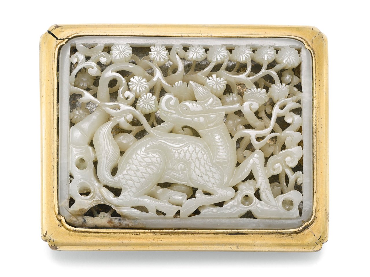 A RETICULATED JADE ‘QILIN’ PLAQUE