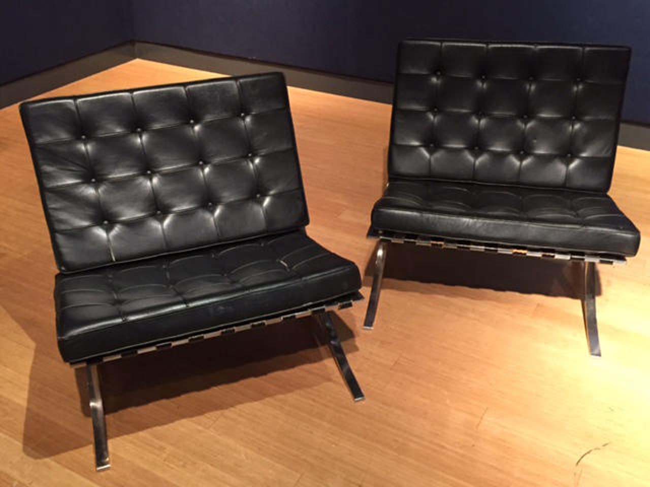 A pair of Contemporary chromed metal and leather upholstered Barcelona chairs