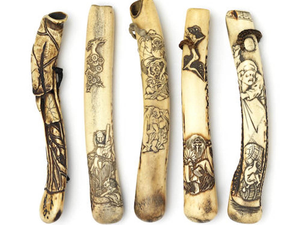 Comprising eight kiseruzutsu (pipe cases), including five of stag antler, four of otoshi-zutsu type, one carved with Daikoku chasing away a rat on rice bales, 19.5cm (7 5/8in) long; one carved with Sojobo, the tengu king, 19.7cm (7¾in) long; one with Daikoku, Hotei and Benten, 20.9cm (8¼in) long; and one carved with Shoki on horseback and a demon cleaning the horse's hooves, 20.5cm (8 1/8in) long; and one of senryu-zutsu type, in the form of lotus leaves, 19.7cm (7¾in) long; three of wood, comprising one in the form of a fish, 20.8cm (8¼in) long; one of a man stretching, 18.7cm (7 3/8in) long; and one carved as Tenaga, 20.5cm (8 1/8in) long; a leather tabako-ire (tobacco pouch) with an ivory mae-kanagu (clasp) carved with a shishi among peonies, 12.5cm (4 7/8in) wide, with kiseruzutsu en suite; another with a silvered metal mae-kanagu (clasp) in the form of a peony, 15.2cm (6in) wide, with kiseruzutsu en suite; a leather tabako-ire, the mae-kanagu cast with a rakan, 13cm (5 1/8in) wide; a wood tonkotsu (tobacco box) carved with Shoki, the cover in the form of a demon, unsigned, 9.2cm (3 5/8in) high; a bamboo tonkotsu with kiseruzutsu engraved with figures and landscape with a poem, the kiseruzutsu 20.3cm (8in) long; a kiseru (pipe) of silver and bamboo, carved with floral medallions and scrolling foliage, 18.4cm (7¼in) long; six others of brass, silvered metal and bamboo; and a yatate (portable writing set), of shibuichi, the bowl formed from a fuchi-gashira, inlaid with dragonflies, signed Masayuki (Shozui), 18.7cm (7 3/8in) long. (21)