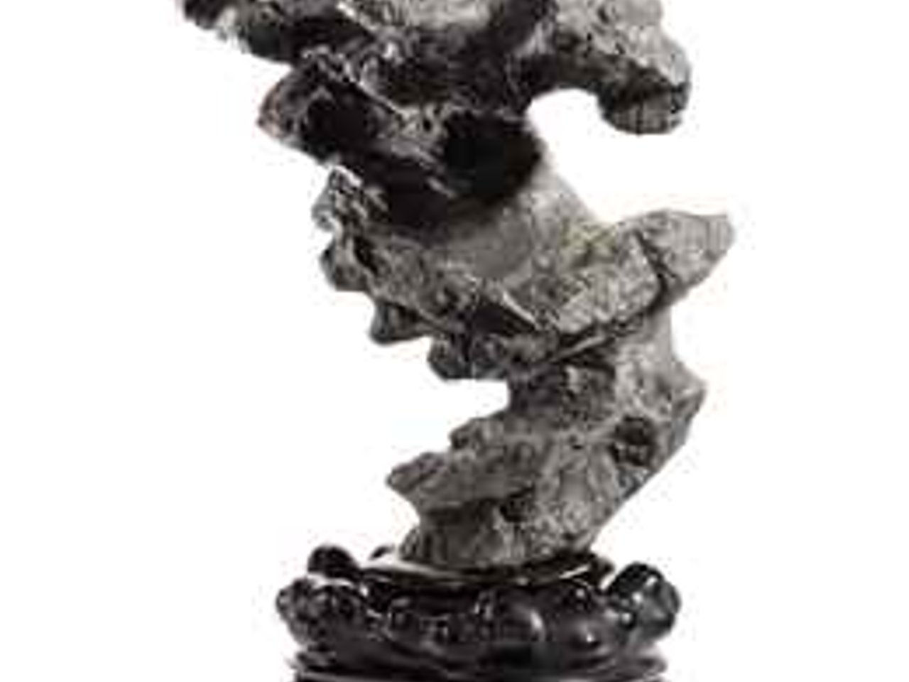 The dark-grey Lingbi stone is of elongated form rising and twisting to create an internal tension, with angled protuberances and crevices, incised on one side with a four-line inscription excerpted from Eulogy of the Eighteen Luohan by the Song dynasty poet Su Shi, signed Jin Nong; another side with a long inscription which can be translated as 'This stone is awkward-shaped but has a clear sound when struck, therefore one can only comprehend it with one's heart/ mind. If Mi Fu saw it he would bow down before it, if it were Su Shi he would fold his arms in admiration.