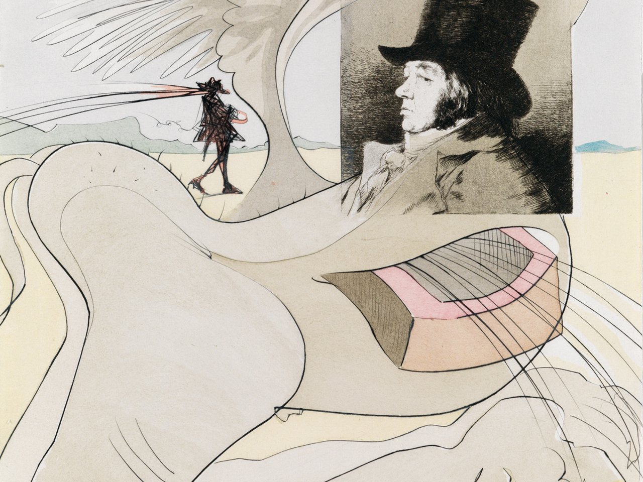 Portfolio with 80 heliogravures from Goya's etchings with aquatint from Los Caprichos reworked by Dalí with drypoint and with stencil coloring, 1977. 450x315 mm; 17 3/4x12 1/2 inches (sheets), full margins, loose as issued.