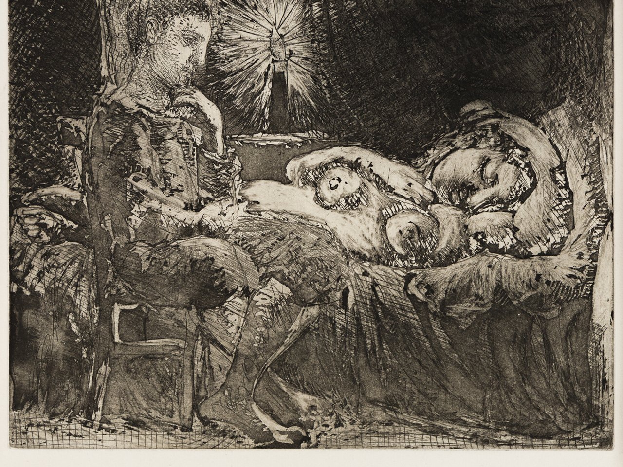 This print, however, portrays a tranquil scene of a sleeping woman--Marie-Thérèse--her fertile feminine features illuminated by candlelight, with a young man (likely intended to symbolize Picasso himself) sitting and thoughtfully watching her at rest. A single candle illuminating the scene creates a stillness and chiaroscuro reminiscent of Rembrandt's nocturnal scenes.