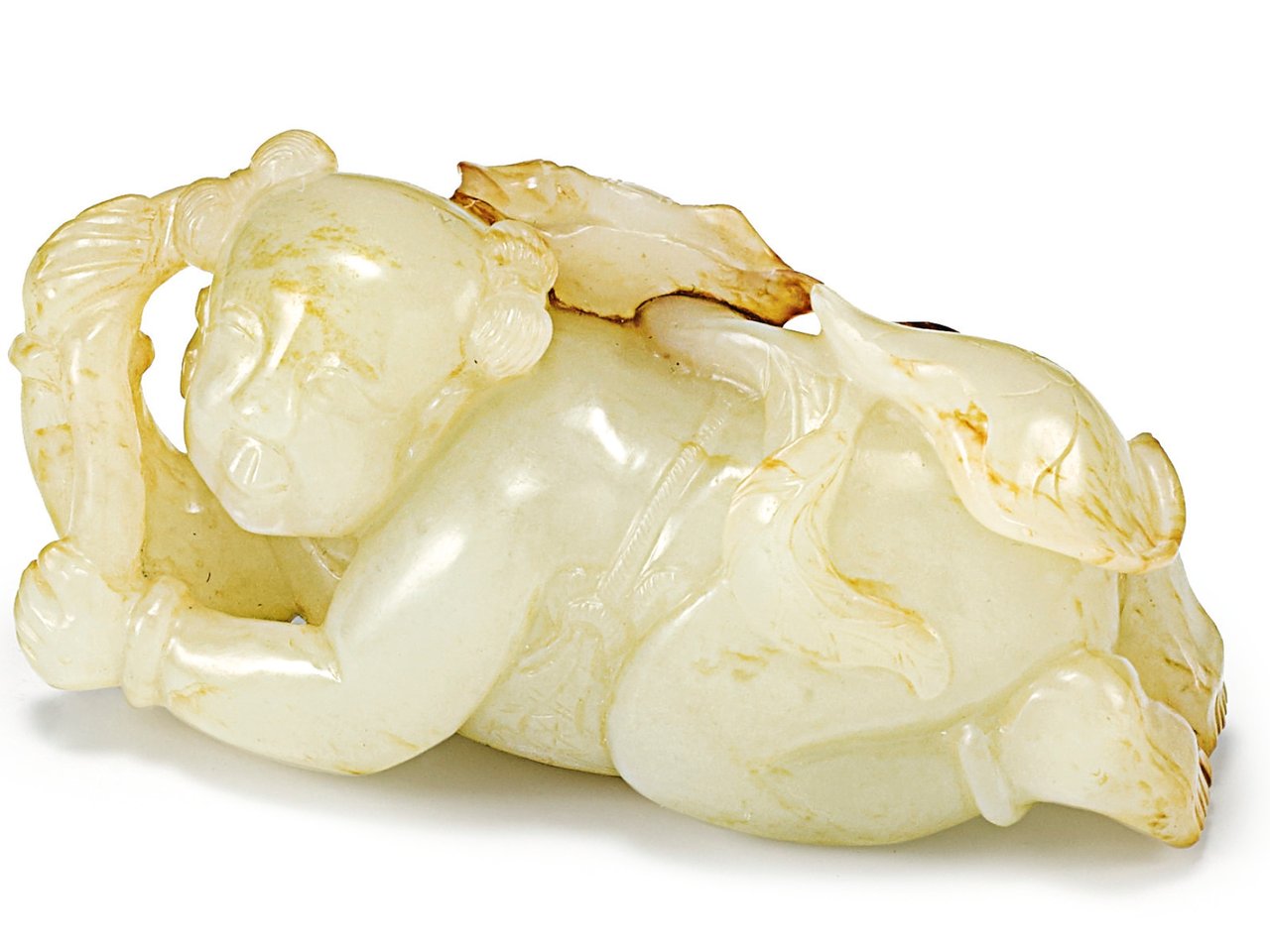 portrayed lying on his front and carrying a spray of lotus leaves behind his back, the stone with faint russet veins