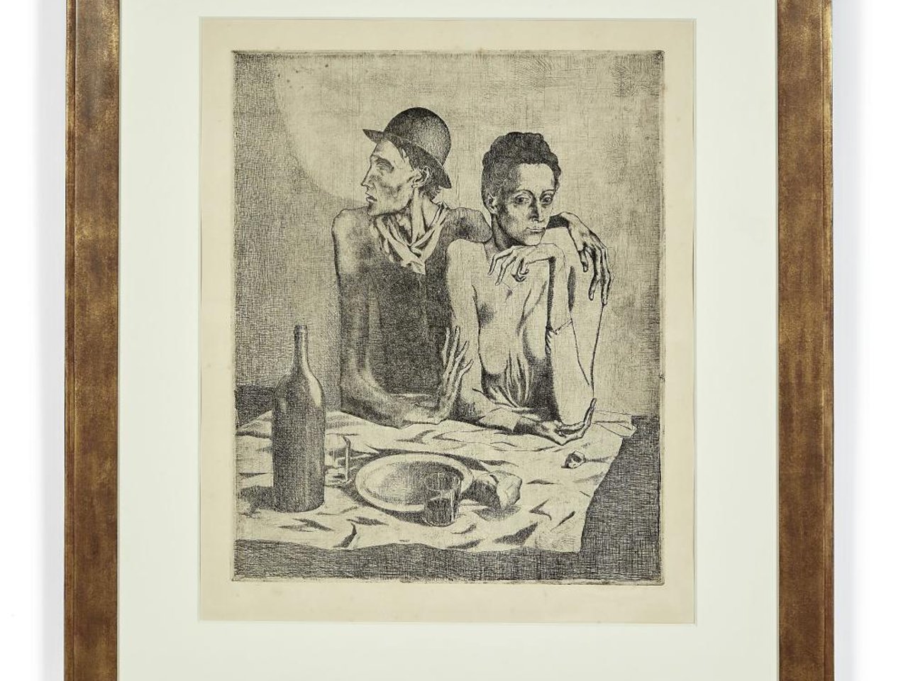 Ambroise Vollard, célèbre galeriste et marchant d'art, qui a exposé Picasso dès 1901, achète et procède à l'aciérage des plaques de zinc. En 1913, le marchand édite, la suite des Saltimbanques, auquel le repas frugal est adjoint (Bloch 1 à 15) Ce couple taciturne empreint d'une certaine tendresse tactile cristallise à lui seul cette misère sociale et profonde souffrance intérieure.