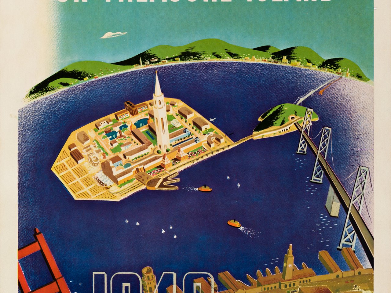 The 1939-1940 World"s Fair in San Francisco was held on a man-made island in the Bay known as "Treasure Island." The exposition was a celebration of the completion of the two main bridges, Golden Gate and San Francisco Bay, and as a "Pageant of the Pacific." A plaque on Treasure Island explains, "This artificial island was constructed of bay sand in 1936-7 and was the site of the Golden Gate International Exposition, Feb. 18, 1939-Sept. 29, 1940. Tall towers, gigantic goddesses and dazzling lighting effects turned the island into a "magic city." The exposition celebrated the ascendancy of California and San Francisco as economic, political and cultural forces in the increasingly important Pacific region. Treasure Island has been a U.S. Naval station since 1941." Rare .