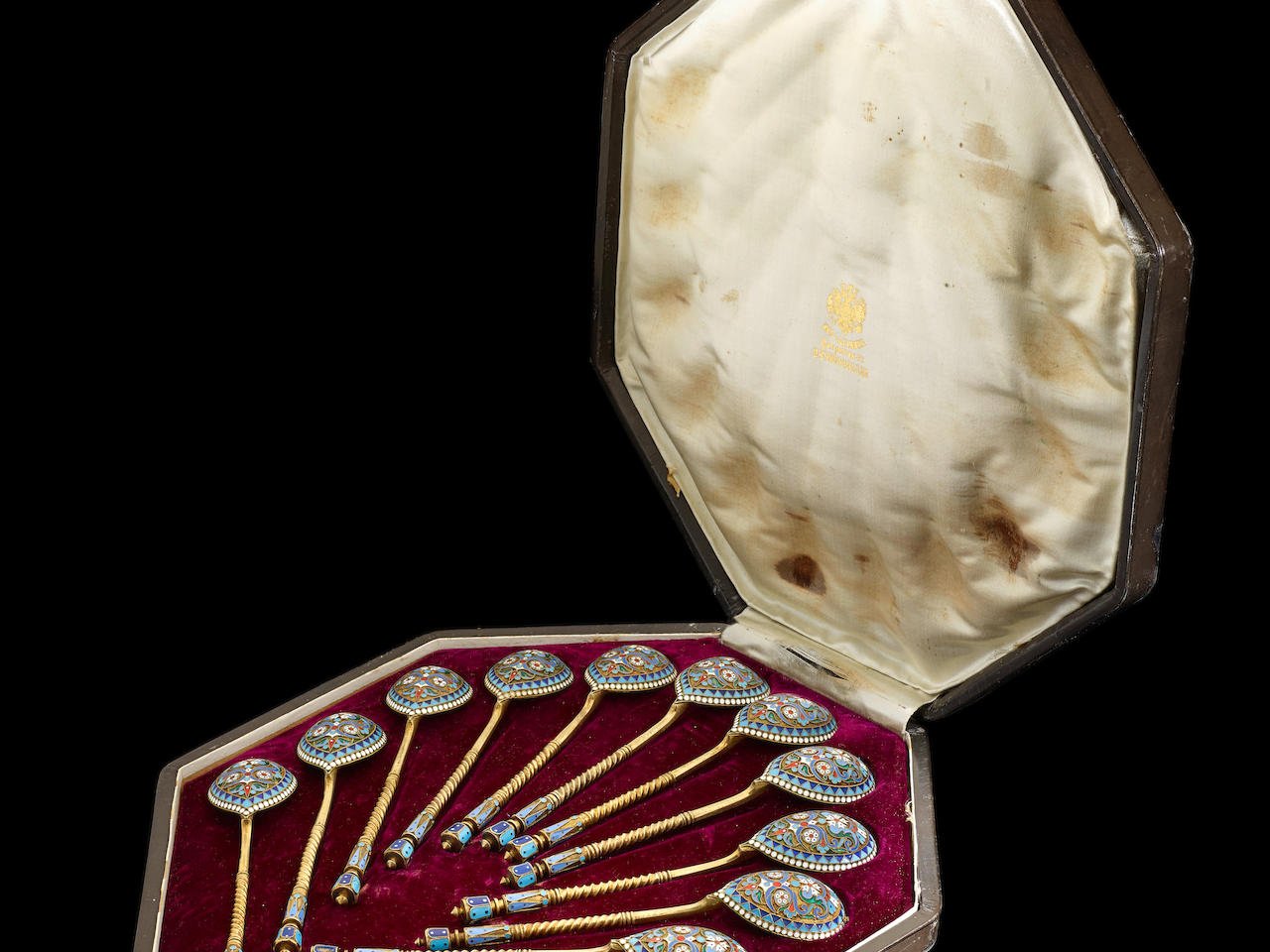 A silver-gilt and enamel set of twelve teaspoons by Anonymous