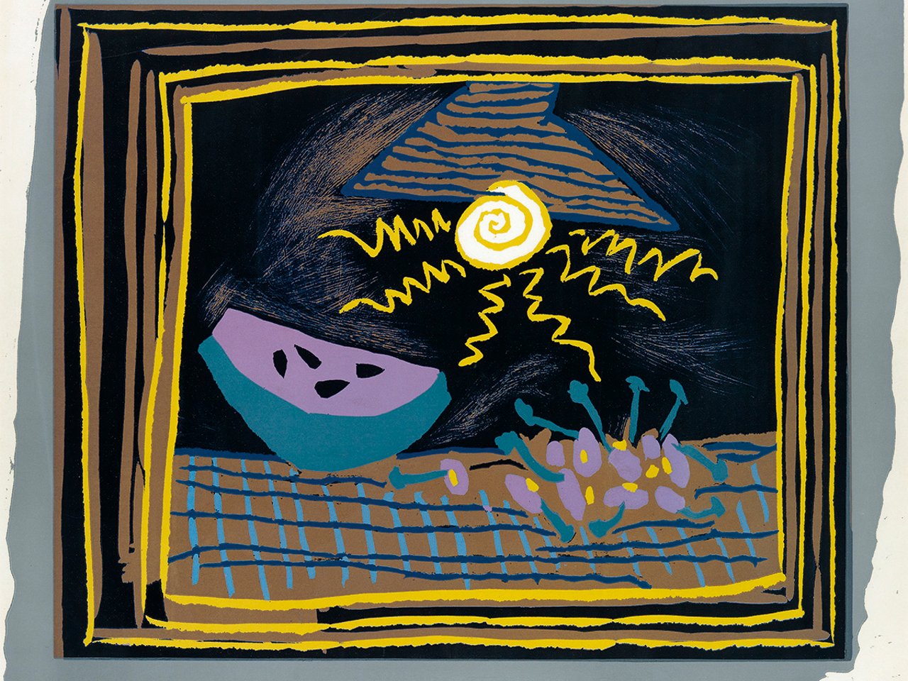 Picasso developed an extraordinary solution to the labor-intensive and cumbersome necessity of printing a color linoleum cut from multiple blocks, each representing a different color in the completed subject and requiring strict attention to registration: rather than use separate blocks for each color, he printed the whole image from just one block in the so-called "reduction" method. The single block was printed in the lightest color, then cut further and printed successively from the lighter to the darker colors. While this required immense creativity, to plan how each successive cutting of the linoleum block would produce the final composition, and allowed little room for error, it also enabled Picasso relative freedom of proofing these prints without the multiple steps and many additional studio hands necessary for etching and lithography; this creative liberation resulted in some of the most luminous and joyful images in Picasso's entire oeuvre . Bloch 1098; Baer 1301.