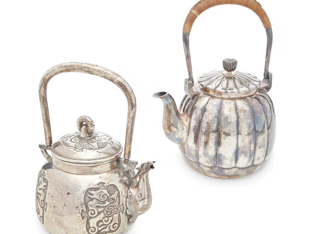 Each cast in silver, hammered, and worked on the surface, the first formed as a lobed melon, the cover surmounted by a chrysanthemum finial, the loop handle wrapped in bamboo, stamped on the underside Miyamoto kinsei (Respectfully made by Miyamoto), and Jungin (Pure silver); the second of compressed ovoid form decorated with shaped panels of stylized dragons in swirling clouds in repoussé, the spout formed as a mythical beast, the dome cover finished with a double ring finial