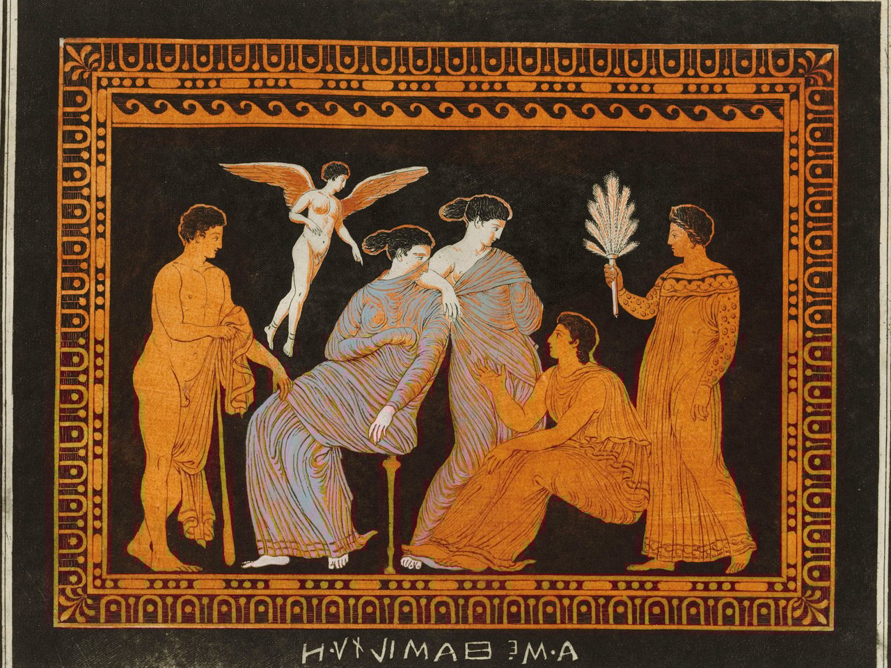 'Edition splendide et de grand luxe' (Cohen-de Ricci) of this catalogue of the first collection of vases formed by Sir William Hamilton while British Plenipotentiary to Naples. Having purchased in 1766 the Porcinari collection of Greek (then considered Etruscan) vases, Hamilton quickly added to it other important specimens of ancient vases, coins, bronzes, glass and terracotta. The British Museum's Department of Greek and Roman Antiquities then acquired the collection in 1772 for £8,400. Although the first two volumes are dated 1766 and 1767 respectively, these dates are now thought to have been falsified in order to hide d'Hancarville's plagiarism of Octavian Guasco, whose own work was published in 1768 (see I. Jenkins & K. Sloan, Vases and Volcanoes, Sir William Hamilton and his Collection, London: British Museum, 1996, pp. 51 and 99). Publication of volumes III-IV was interrupted when d'Hancarville was expelled from Naples, and the plates seized by his creditors. Blackmer 845; Brunet I, 321; Cohen-de Ricci 474; Berlin Kat. 890; RIBA 1568; Vinet 1528.