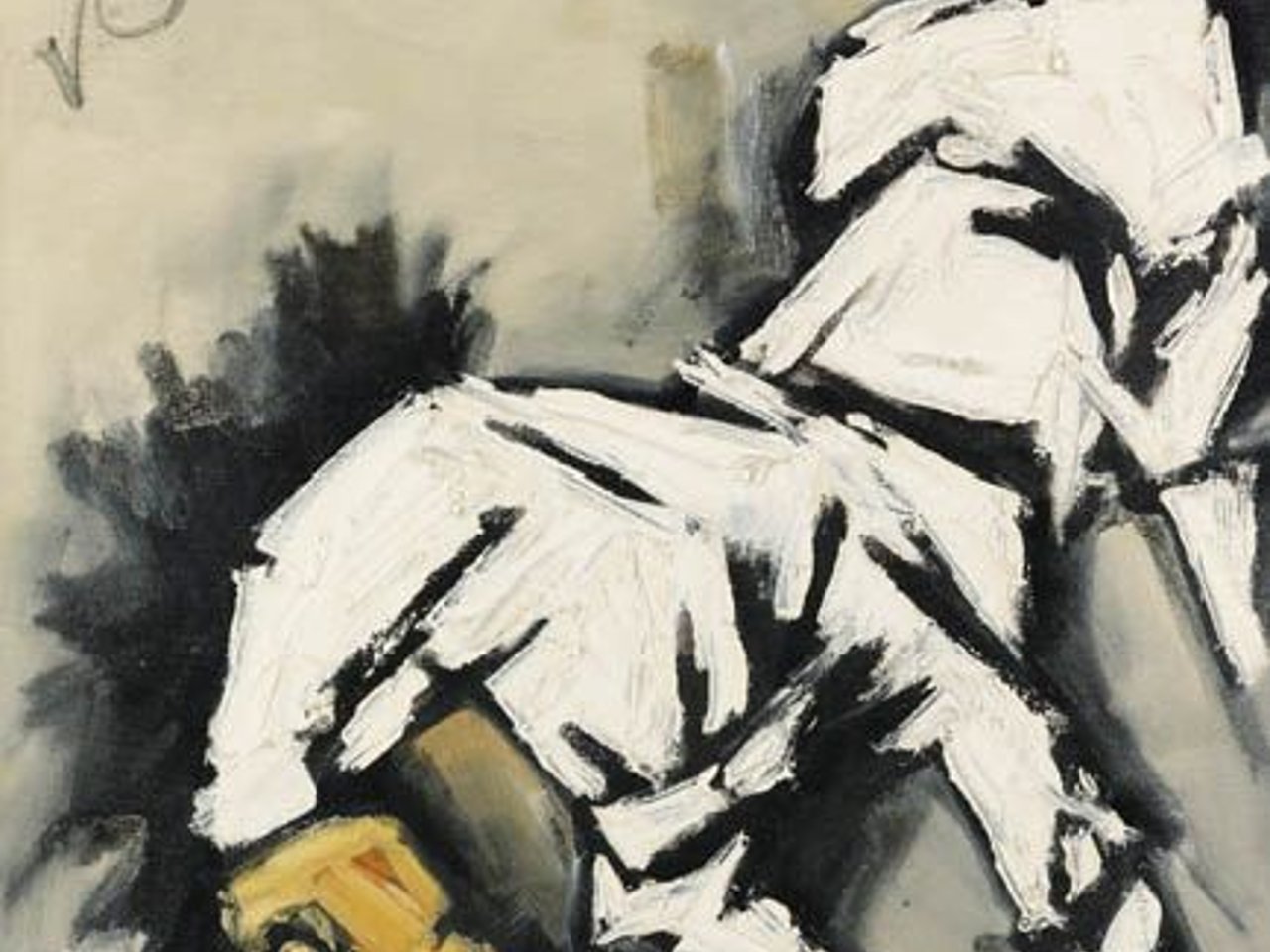 The current work, which has not been on the market in decades, exhibits the finest qualities of Husain's horse paintings--sweeping, bold brushstrokes, a chiseled, white horse with rich black contours brilliantly set against a muted, greenish, tan background. Taken as a whole, the expressive lines betray the influence of Franz Kline and Willem de Kooning, while parts--notably the yellowish orange head--evoke Picass's own equestrian portraits. The horse is at once grand and powerful, sculptural and agitated in expressive movement.