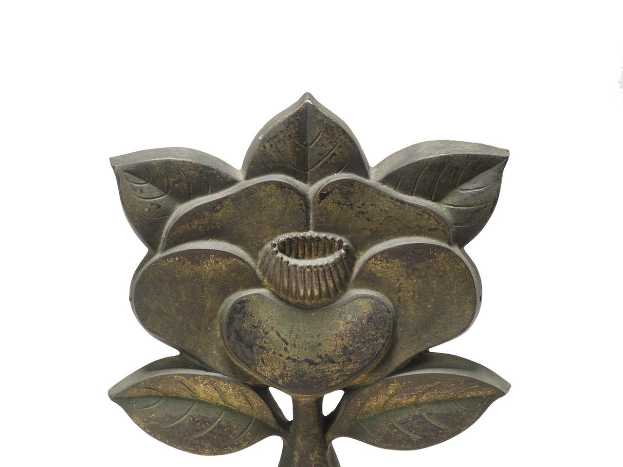 Cast and carved as a stylized blossoming camellia, the surface embellished with gilt; with a fitted stand
