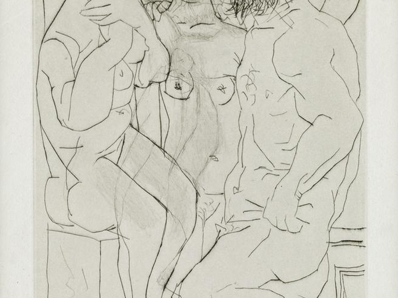 Drypoint, 1933. 318x185 mm; 12 5/8x7 1/4 inches, full margins. The deluxe edition of 50 on large format Montval paper, aside from the regaular edition of 260 on smaller paper. Signed in pencil, lower right. Vollard watermark. Printed by Lacourière, Paris. Published by Vollard, Paris. A superb impression with strong burr, notably on the head and hair of the woman in the center.