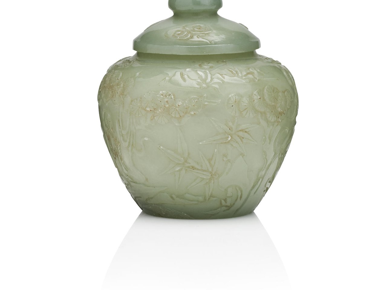 The cover with flame finial above relief carved cloud motifs, the jar featuring two scholars in a mountainous landscape of pine and bamboo, in a pale green stone with darker inclusions