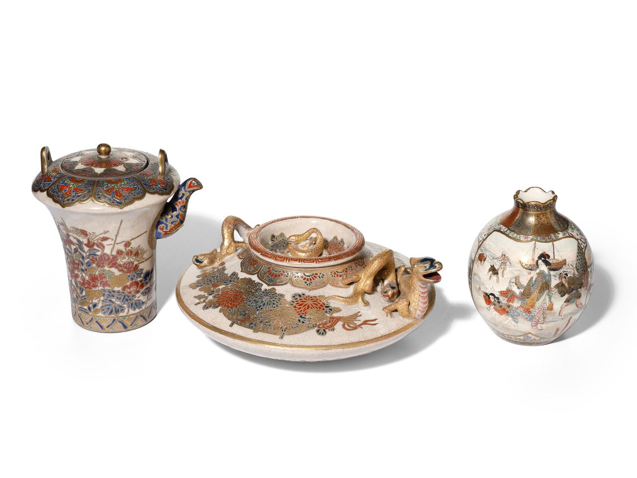 a clear, crackled ground, comprising a small, bulbous vase in pomegranate form painted with two panels of courtiers before a curtain of state, and a beauty and attendants on a seaside outing, punctuated by smaller panels containing torii gates and Mount Fuji, and a rocky shoreline with pine trees, the surrounding areas with geometric patterns, signed Matsumoto Shozan; a squat ewer set on tripod feet and applied with a spout and handle formed as coiling dragons, the cover with a serpent finial, the body painted with baskets of blossoming flowers, the underside with floral sprays, signed Hododa sei, Meigyoku ga and with the mark of the Shimazu family; a small ewer with a wide shoulder tapering to the foot and applied with a upright spout, the body painted with blossoming flowers on a bamboo stand, the shoulder with a lappet band and the cover with a chrysanthemum finial, signed Setsuko and with the mark of the Shimazu family