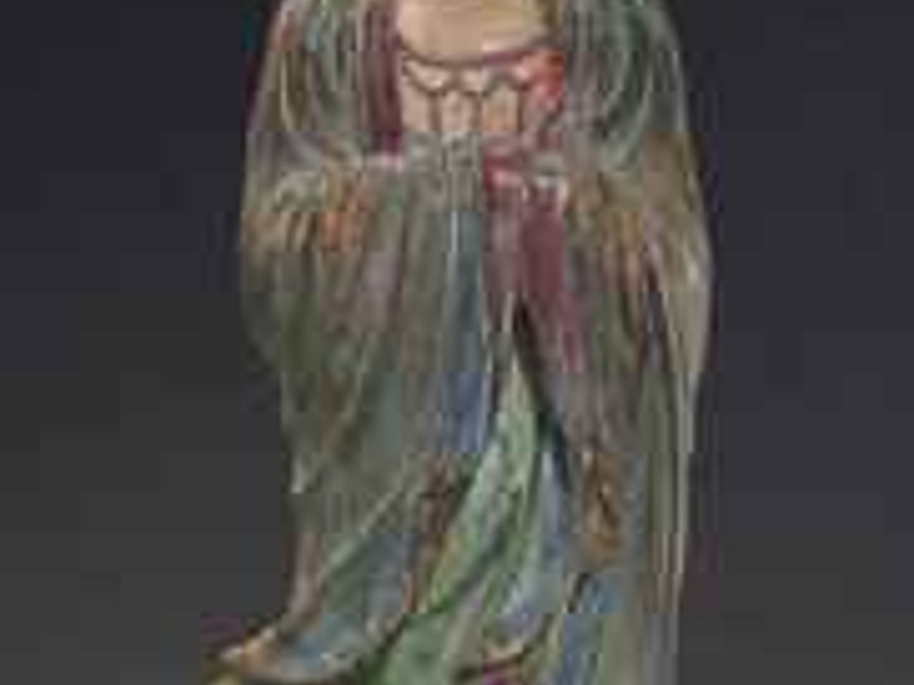 The bodhisattva stands on a rectangular base dressed in flowing robes with the hands clasped together within the heavy folds of the full sleeves. The face is benevolent in expression with pursed lips, full cheeks, and downcast eyes, and is surmounted by a diadem centered by a diminutive image of Amitabha.