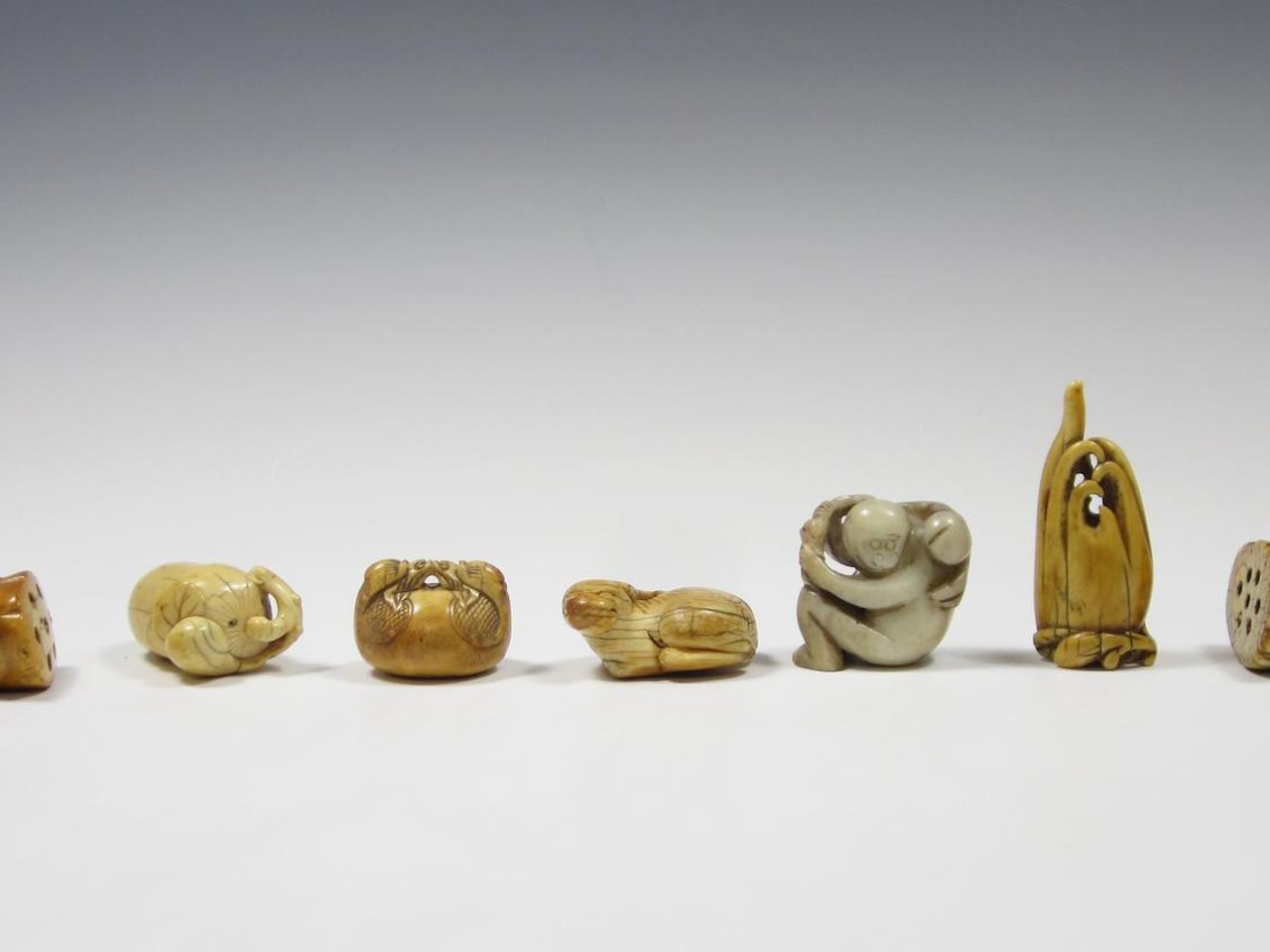 Two ivory karakuri netsuke of lotus pods with emerging shoots, 3.8cm and 2.7cm high, an ivory gourd, 5.1cm long, a marine ivory finger citron, 6.3cm high, a reclining ivory animal, 4.8cm high, an ivory double-headed temple bell, 2.4cm high, together with a grey jade monkey, seated and holding a peach branch,