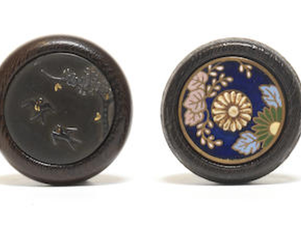 The first with wood bowl, the shibuichi plate inlaid with two swallows flying past a flowering cherry tree, in gold, silver and shakudo relief relay, unsigned, 4.5cm (1¾in) diam.; the second entirely of shibuichi, the plate inlaid with Hanasaka Jiji making withered trees blossom, signed Sofu, 3.5cm (1 3/8in) diam.; the third with a wood bowl, the cloisonné-enamel plate decorated with paulownia and chrysanthemum, unsigned, 4.3cm (1¾in) diam.; the fourth with a wood bowl lacquered with autumn plants, the shibuichi ishime plate inlaid with a gilt-metal flying bird, signed Masahide, 3.7cm (1½in) diam; the fifth with an ivory bowl, carved in the form of a shallow basket for the tea ceremony, the plate of kurogaki (black persimmon) wood, carved as a pile of charcoal and inlaid with a haboki (feather fan for dusting ashes), in silver and shakudo, signed Kozan with kao, 4.5cm (1¾in) diam.; the sixth with an ivory deep and rectangular bowl, the pale shibuichi plate delicately engraved with a small puppet of a nobleman perched on a finger, signed Hakutsuru Senshi to, 4.1cm (1 5/8in) wide; the seventh with an ivory bowl, the shibuichi plate engraved and inlaid with a half-naked figure and a fox, the bowl engraved with mushrooms and pine needles, unsigned, 4.1cm (1 5/8in) diam.; the eighth with a silver plate, finely engraved in katakiri-bori (engraving with an angled chisel emulating brushstrokes) and kebori (plain line engraving) with a running horse, signed Naoharu with a kao, 4cm (1 5/8in) diam. (8)