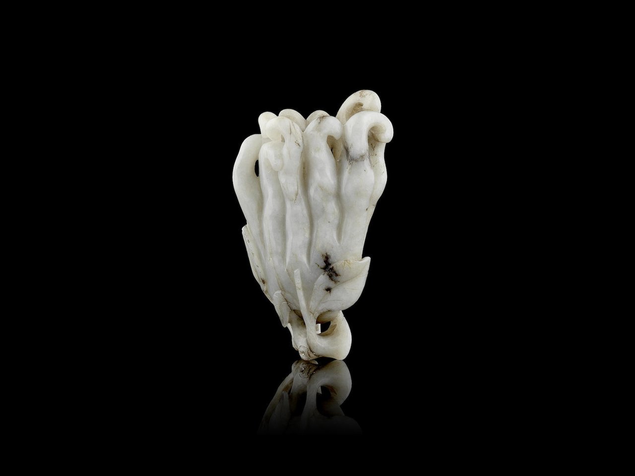 The fruit carved with many tendrils, the base issuing a leafy stem, the exterior with a fine, smooth polish, the interior well hollowed, the stone of a creamy grey hue fitted wood stand.(2)