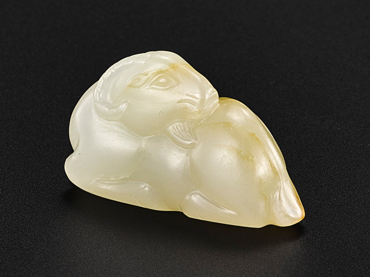skilfully worked to depict a recumbent ram with the head turned backwards, flanked by a pair of striated horns, the white stone with faint russet patches skilfully worked to highlight the reverse of the animal