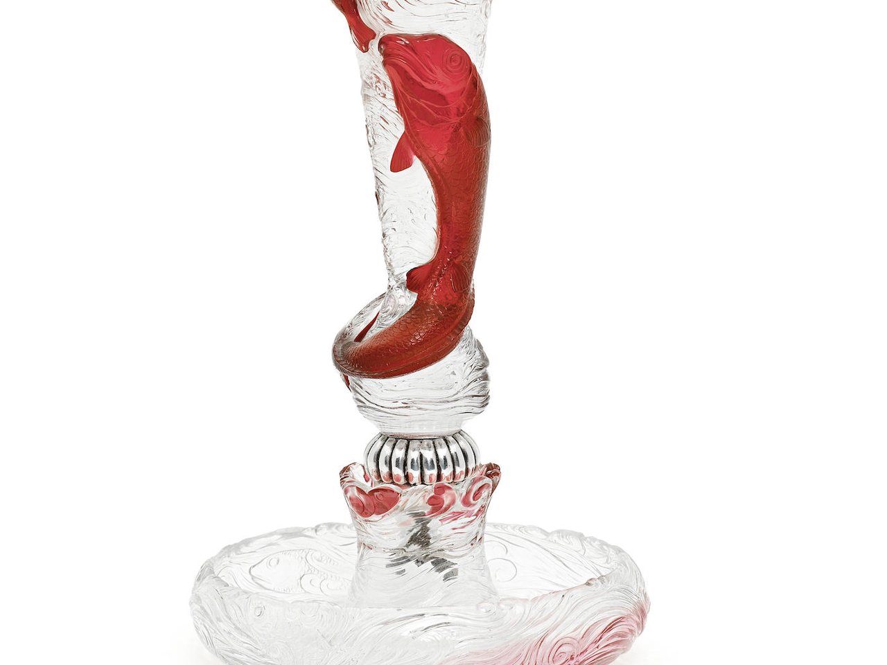 The form inspired by salmon leaping a water spout, the central bud vase in rock crystal glass applied with padded decoration in ruby red representing four fish, carved in high relief against a ground of white water swirling into eddies, raised on a plated-metal bulb set into the raised centre of a glass bowl carved all around with fish among waves, the bowl mostly clear although with a streak of red at one side and with a border of fish-heads and waves in red glass surrounding the metal bulb