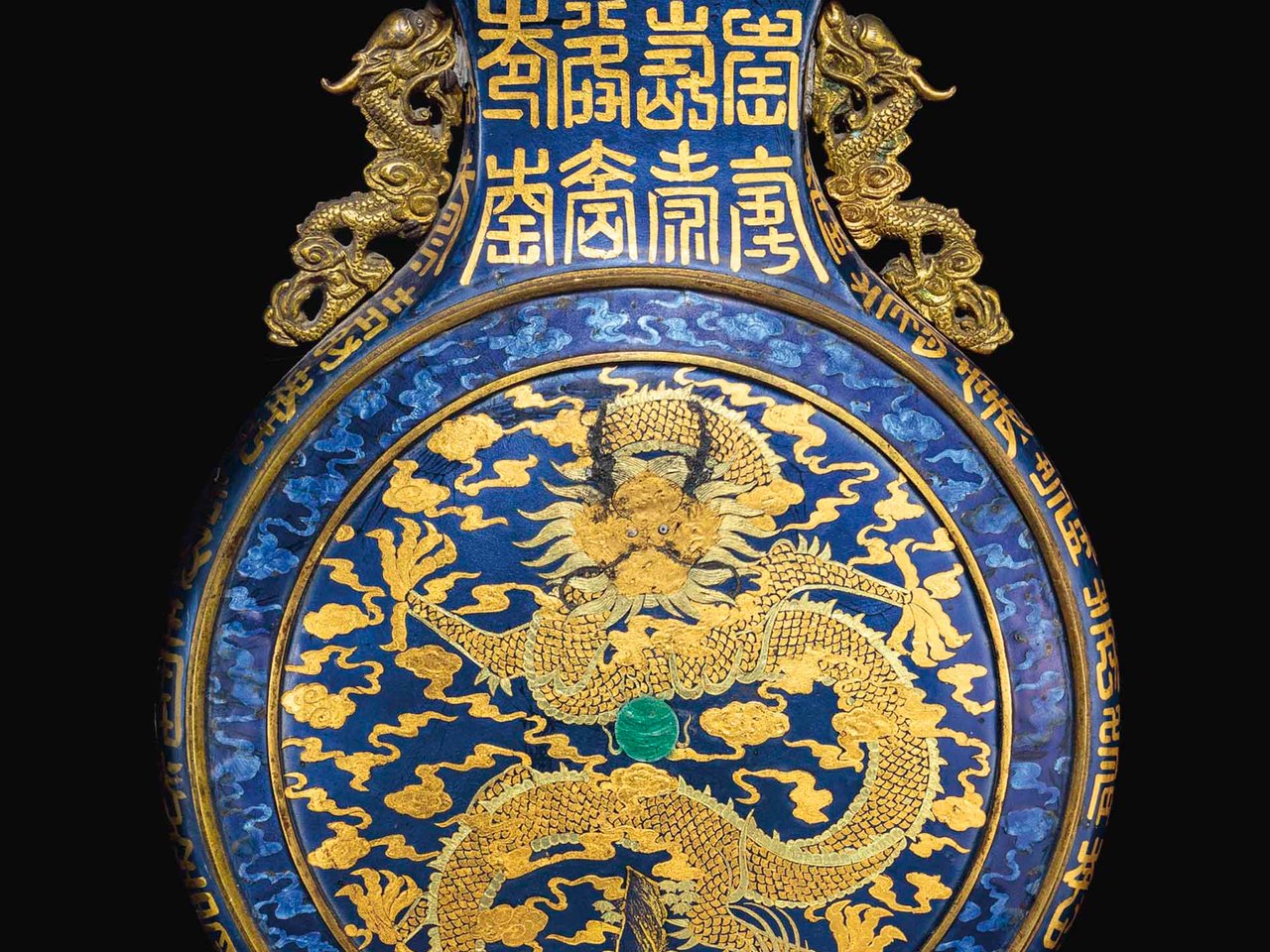 Each side of the body is decorated in gold foil with a five-clawed dragon with silver horns and whiskers leaping amidst clouds above a wave-tossed mountain in pursuit of a green enamel flaming pearl, all on a basse taille enamel-ground with outer border of blue clouds, while the foot, narrow sides and neck, which is flanked by a pair of gilt-bronze dragon-form handles, are decorated with shou characters. The cover is decorated en suite, and the interior of the vase and cover are covered in turquoise enamel.