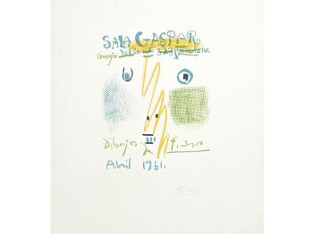 Publicada en: MALLEN, Enrique. Online Picasso Project. E.E.U.U. Sam Houston State University, 1997-2016, 61:021 La edición consta de 50 ejemplares numeradas y firmadas a lápiz por el artista y un tiraje 1000 ejemplares sin firmar ni numerar hechas para la portada de la carpeta. Este ejemplar está firmada por el artista. Sala Gaspar es una galería de arte fundada en 1909 por Joan Gaspar i Xalabarder en Barcelona, España. Promovió los movimientos artísticos de la segunda mitad del siglo XX. Apoyó exposiciones de vanguardia y artistas como Pablo Picasso, Joan Miró, Salvador Dalí, Marc Chagall, Alexander Calder, entre otros. Difundió por América el arte catalán mediante ediciones gráficas diseñadas por los propios artistas, generando una colección de carteles que conmemoraban cada una de las exposiciones. Picasso comenzó a trabajar con Gaspar en 1955. Sus trabajos y exposiciones fueron de tal éxito que la galería se convirtió en un importante centro de difusión de arte español. La pieza presentada en esta subasta es una gráfica proveniente del cartel histórico original editado para una exposición de dibujos que Picasso realizó en abril de 1961. Fuente consultada: sitio oficial de Sala Gaspar www.galeriajoangaspar.com Estimado -30,000