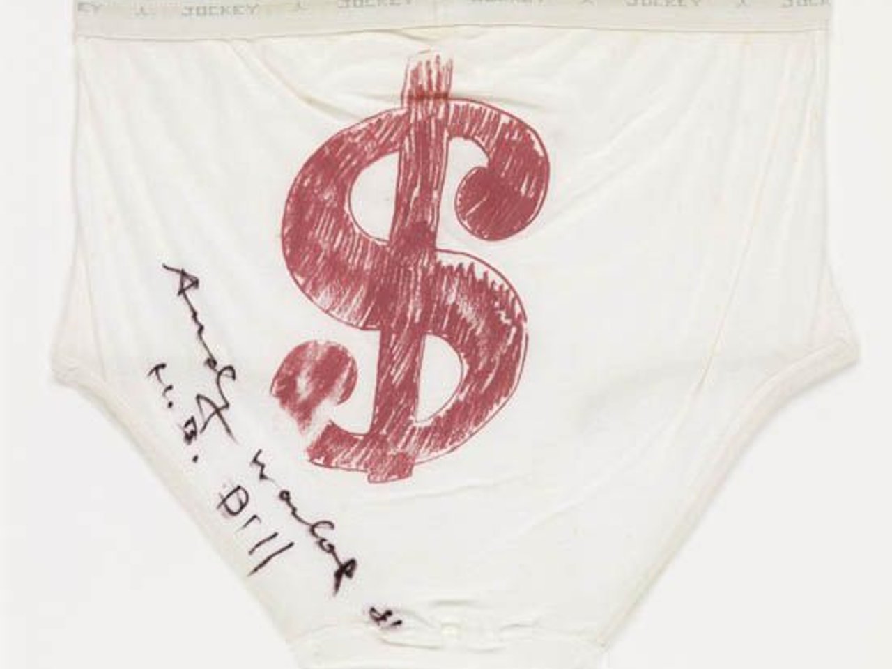 Unique screenprint printed in red on men's white cotton Jockey underwear, 1981. 405x440 mm; 16x17 1/4 inches (irregular edges). Signed and dated by Warhol and signed by William N. Copley in felt-tip marker and black ink, lower left. Ex-collection William N. Copley, Sugar Loaf Key; his widow Cynthia Gooch, Key West; Suzanne Furman Fromm, Contemporary Gallery, Palm Beach; thence by descent to the current owner.